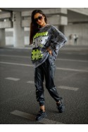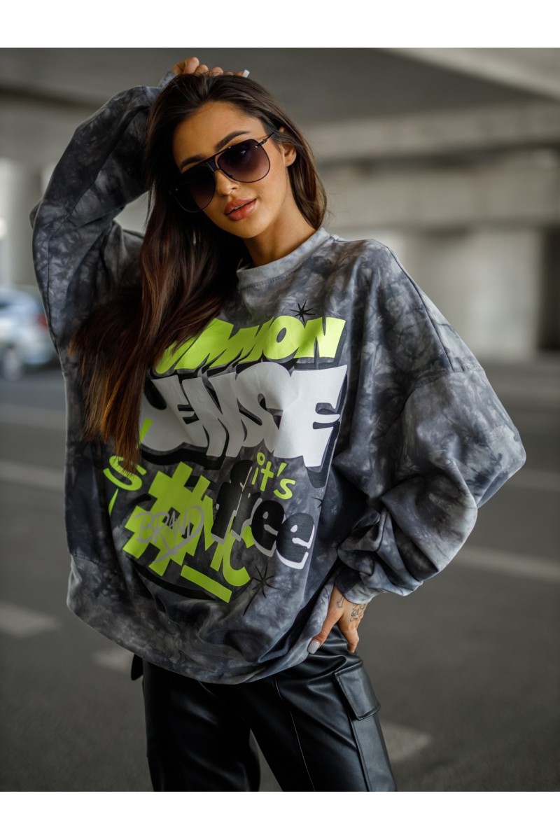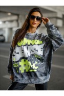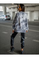 Großes, übergroßes Damen-Sweatshirt zum Überziehen, ohne Kapuze, aus Used-Look-Material. Applikation auf der Vorderseite, Rückseite glatt.