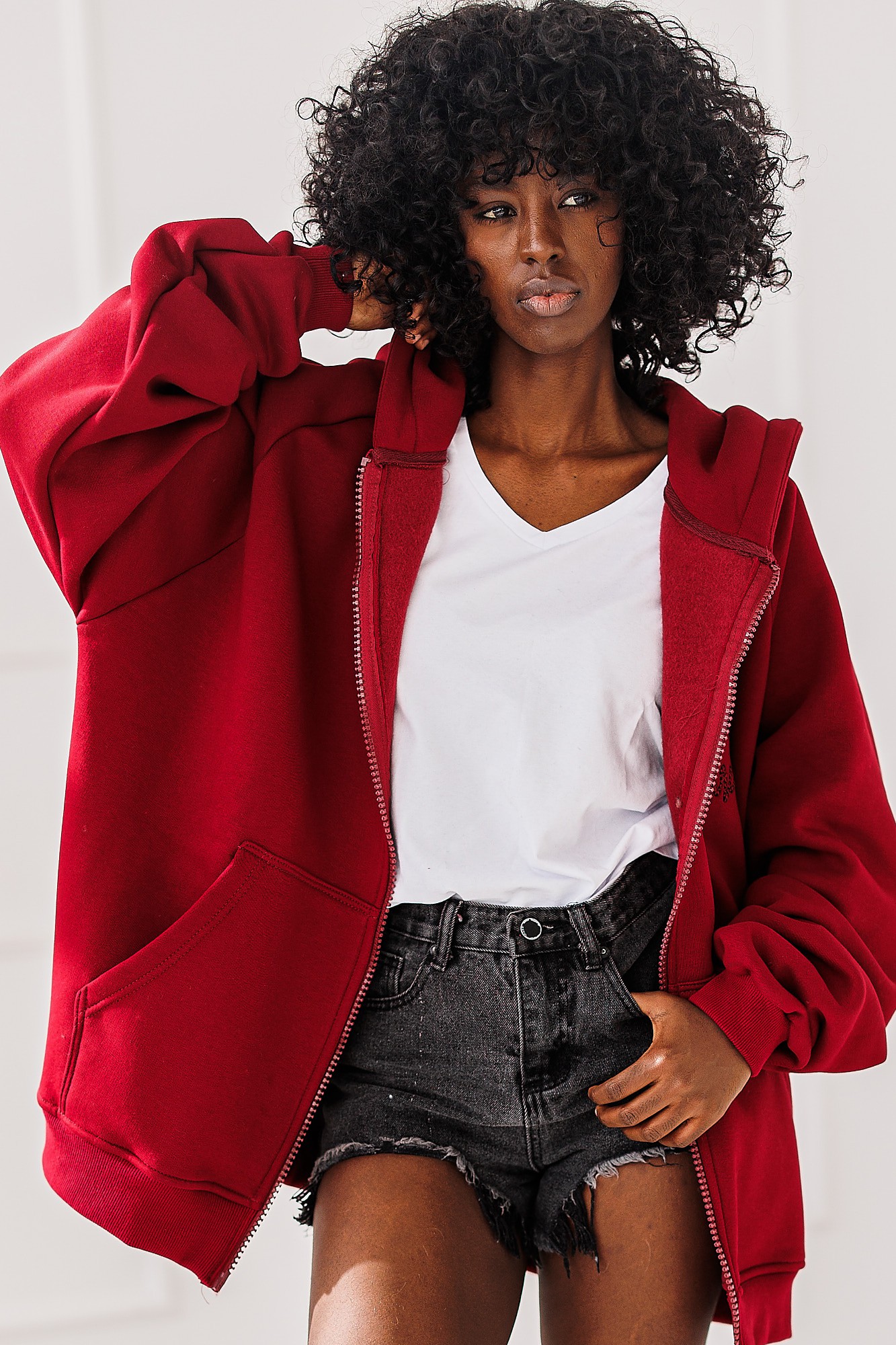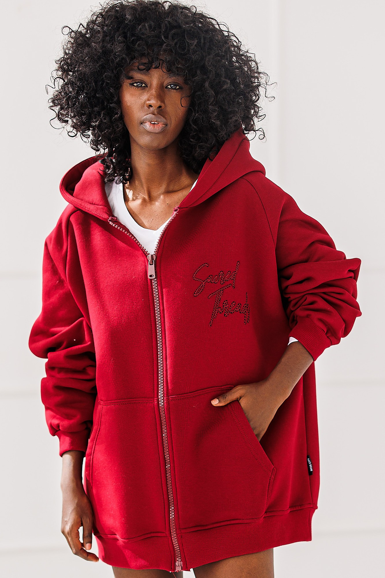 Czerwona Bluza Chill Mode to rozpinany model bluzy z kapturem, ozdobiona stylowym napisem z przodu i na plecach. Idealna dla osób, które cenią modę z duszą - prostą, ale z pazurem.