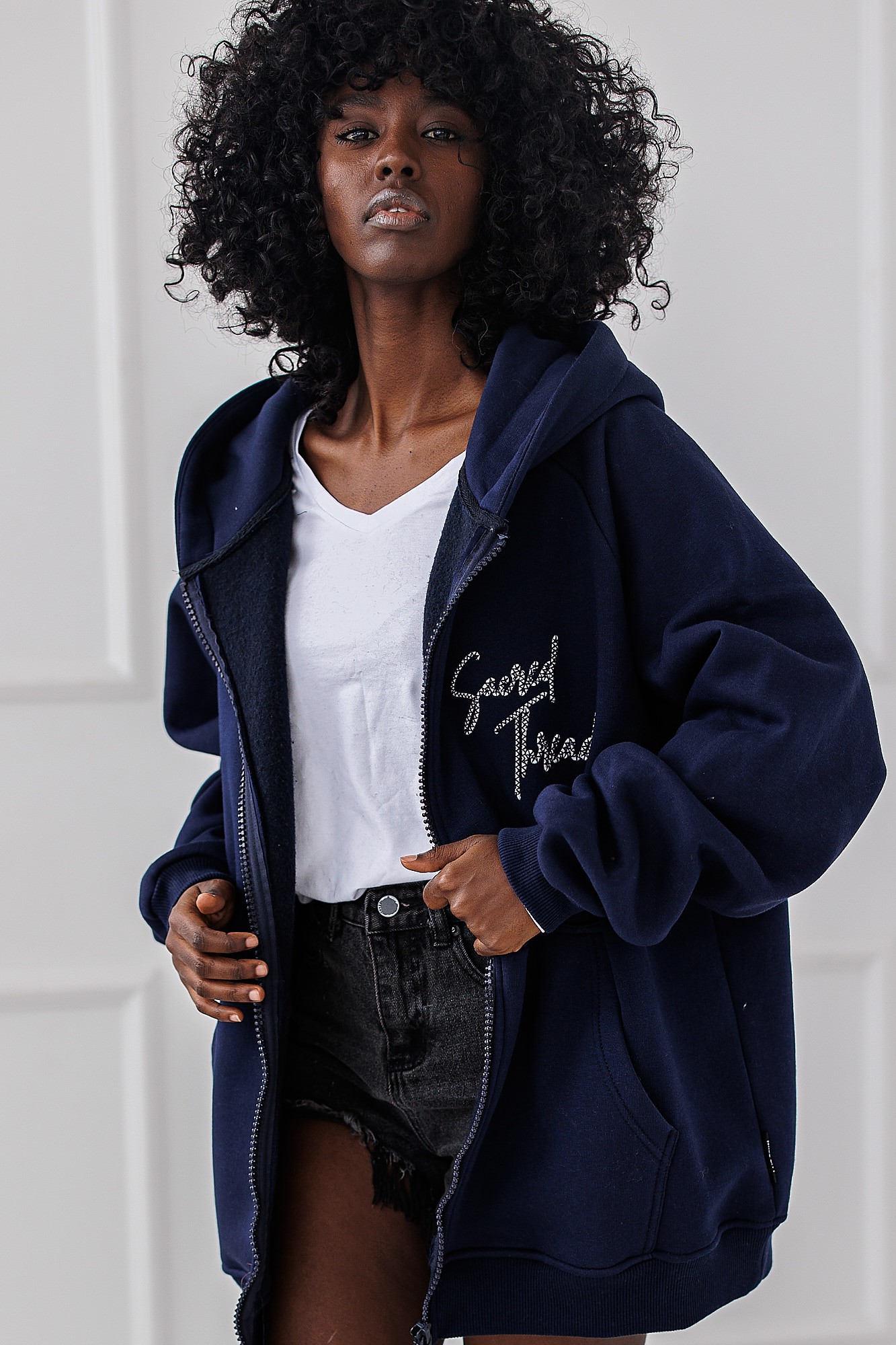 Granatowa Bluza Chill Mode to rozpinany model bluzy z kapturem, ozdobiona stylowym napisem z przodu i na plecach. Idealna dla osób, które cenią modę z duszą - prostą, ale z pazurem.