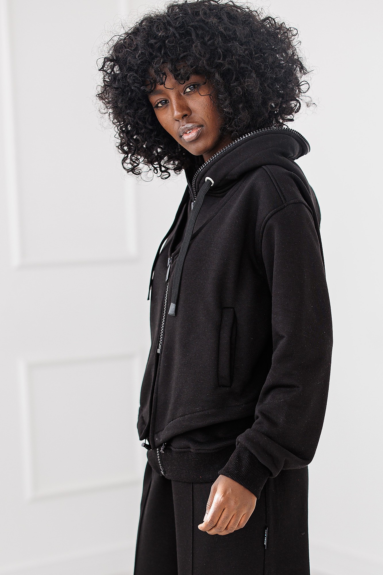 Czarny dres City Comfort, propozycja dla kobiet, które cenią sobie wygodę bez rezygnacji z trendów. Miękka dzianina, a luźny krój z kapturem zapewnia swobodę ruchów. Elastyczny pas w spodniach i zamek w bluzie sprawiają, że dopasowuje się do każdej sylwetki.