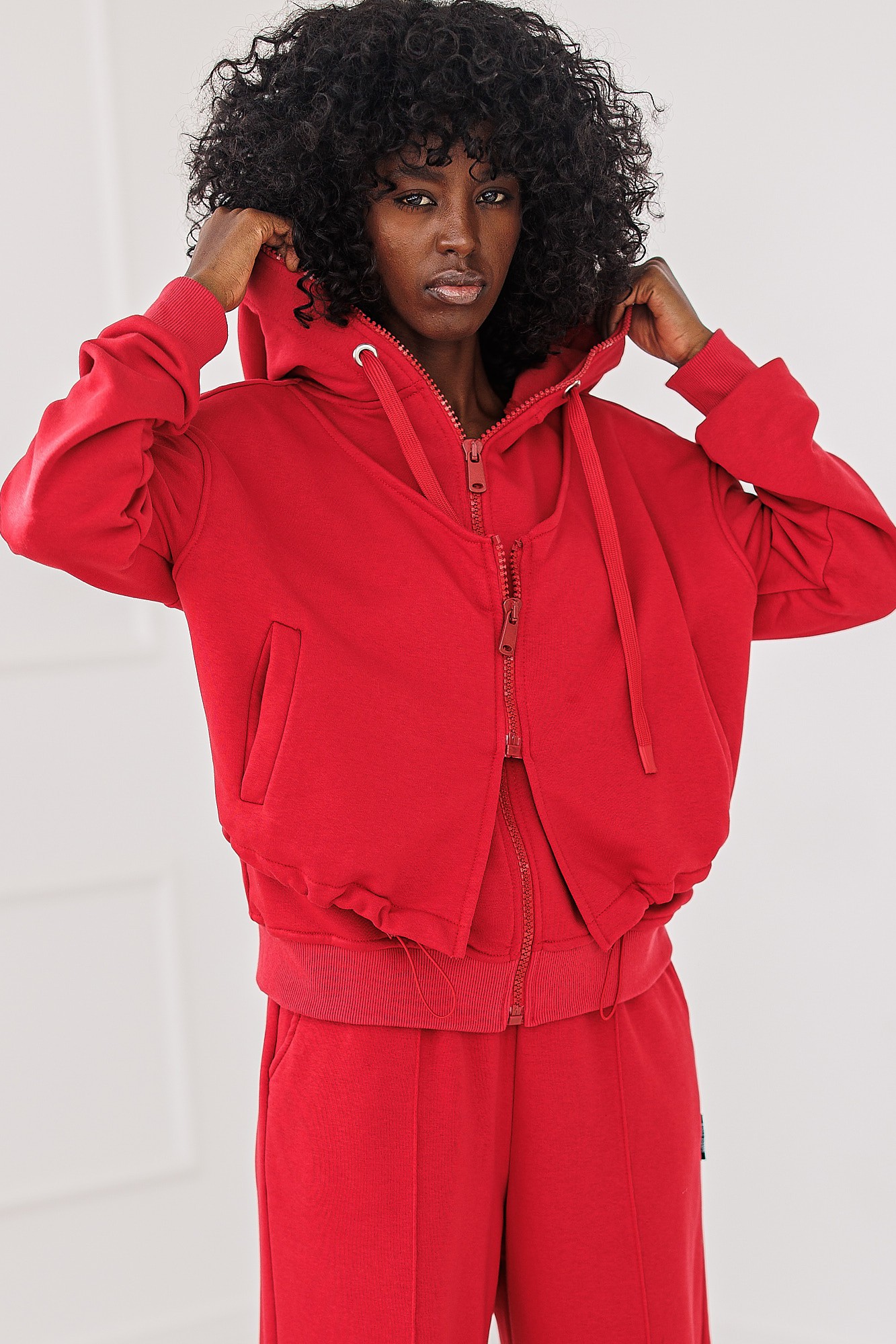 Czerwony dres City Comfort, propozycja dla kobiet, które cenią sobię wygodę bez rezygnacji z trendów. Miękka dzianina, a luźny krój z kapturem zapewnia swobodę ruchów. Elastyczny pas w spodniach i zamek w bluzie sprawiają, że dopasowuje się do każdej sylwetki.