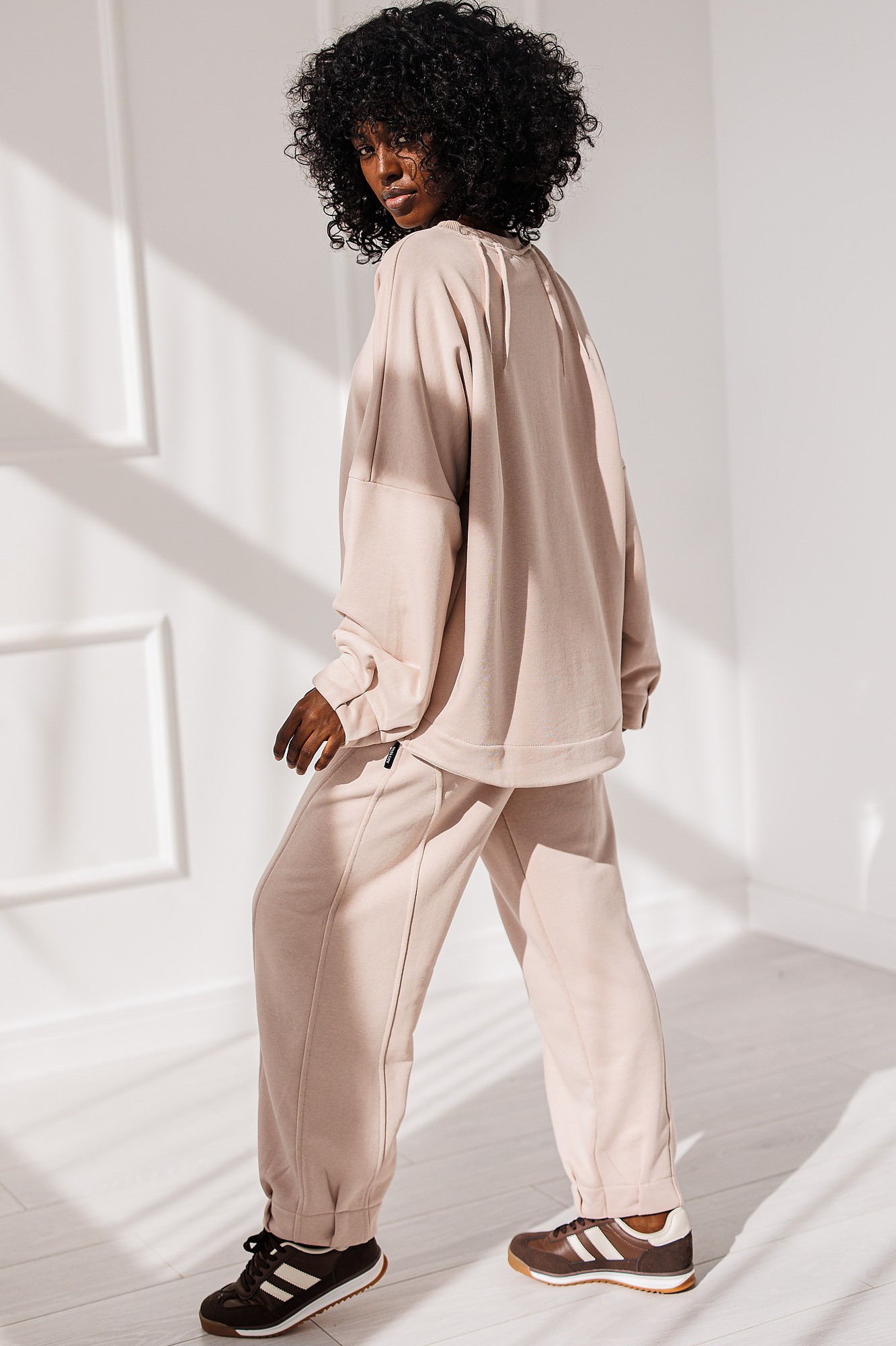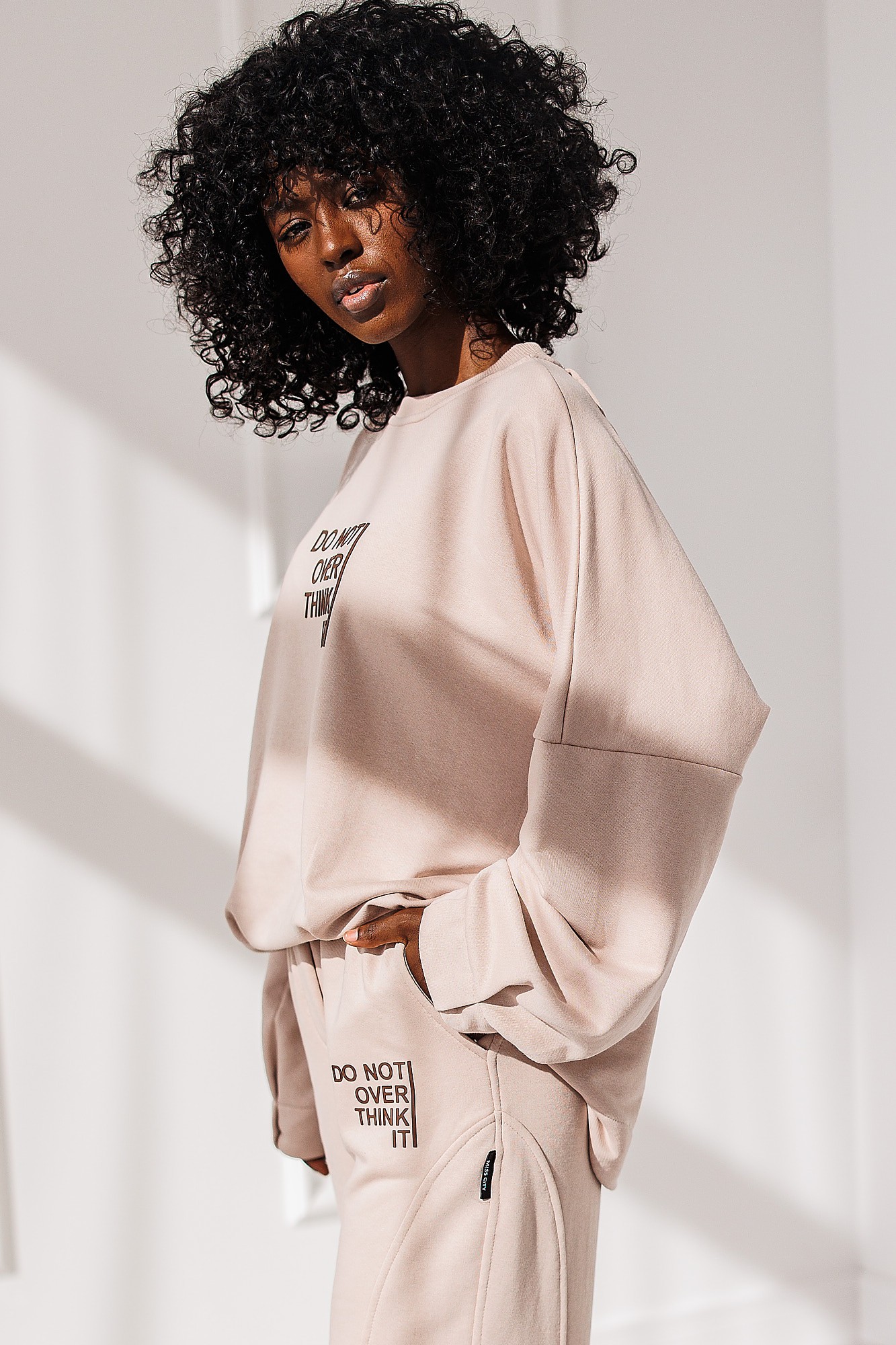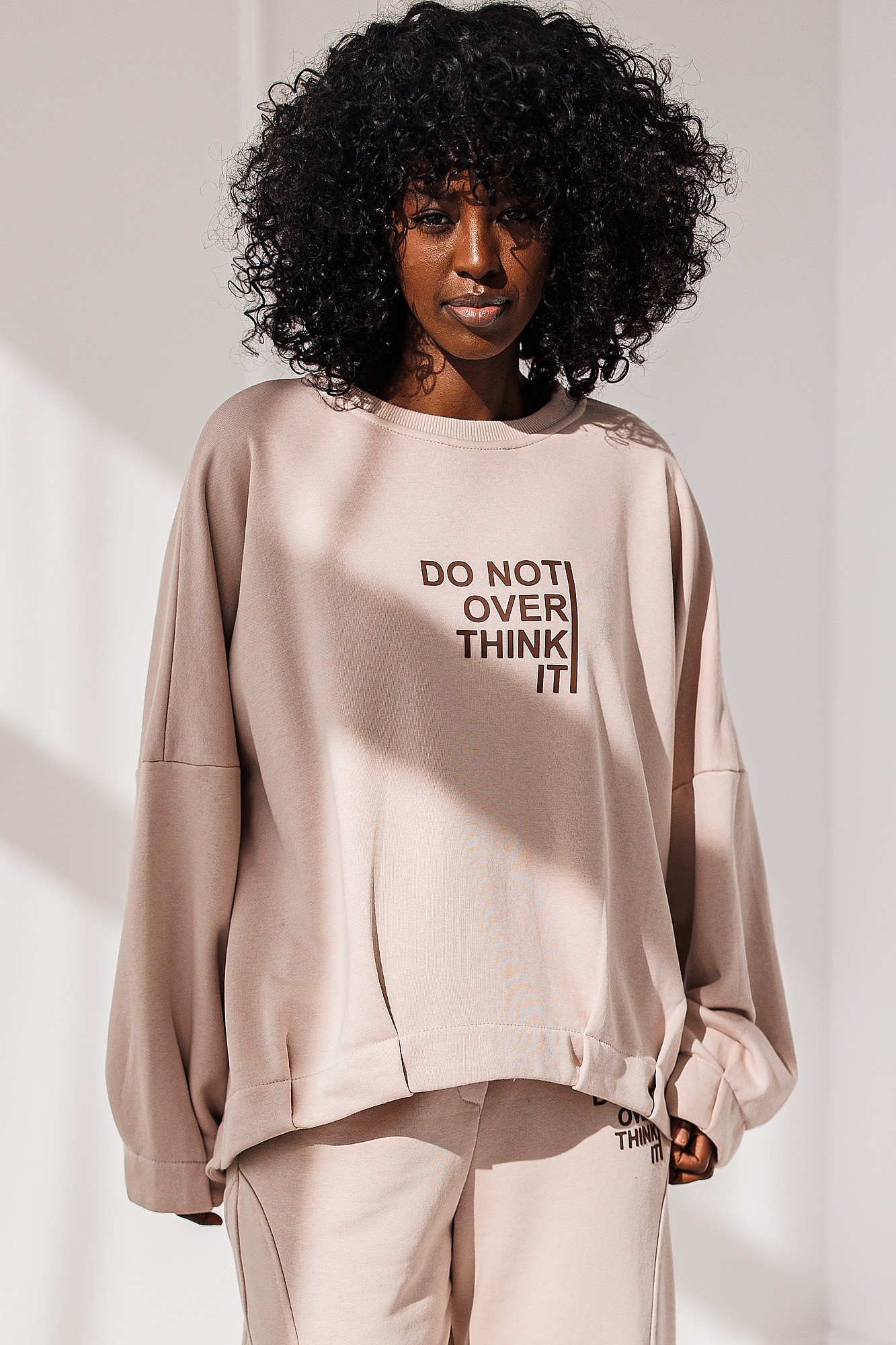 Beżowy dres Overthink Set to idealne połączenie casualowego luzu. Bluza posiada luźny, oversizowy krój i nadruk, który doda Ci pewności siebie. Spodnie z elastycznym pasem i ściągaczami zapewniają komfort i swobodę ruchów.