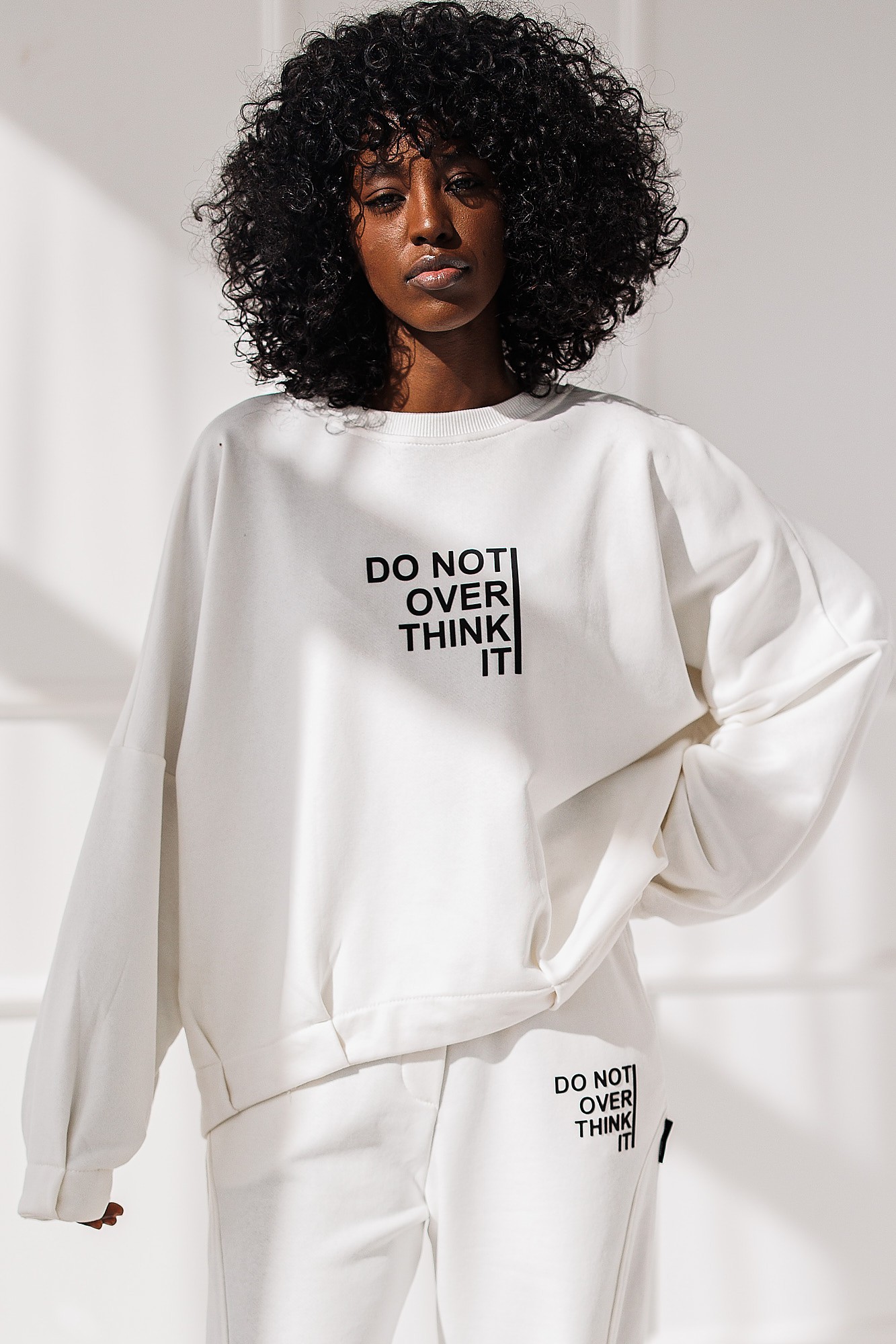 Biały dres Overthink Set to idealne połączenie casualowego luzu. Bluza posiada luźny, oversizowy krój i nadruk, który doda Ci pewności siebie. Spodnie z elastycznym pasem i ściągaczami zapewniają komfort i swobodę ruchów.