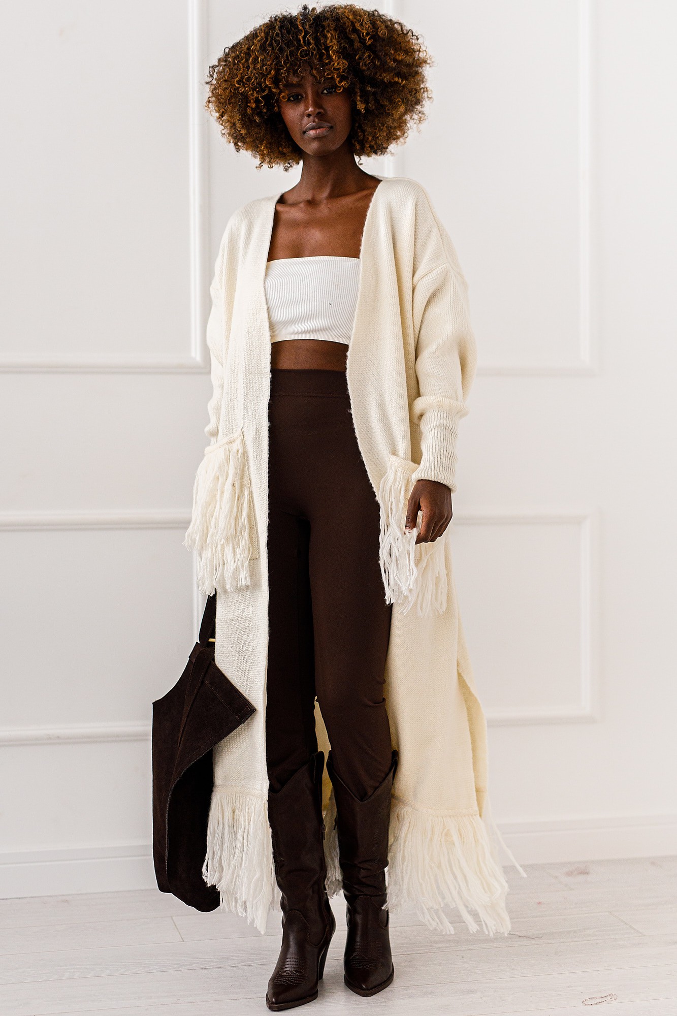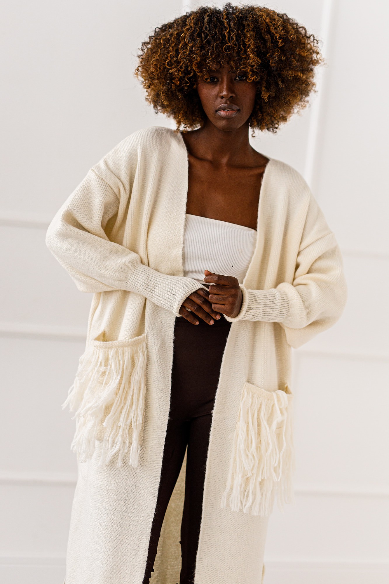 Śmietankowy kardigan Ivory Dream wykonany z przyjemnej, miękkiej w dotyku dzianiny. Frędzle na dole i przy kieszeniach dodają mu charakteru. A oversiz'owy krój sprawia, że idealnie sprawdzi się do codziennych stylizacji.