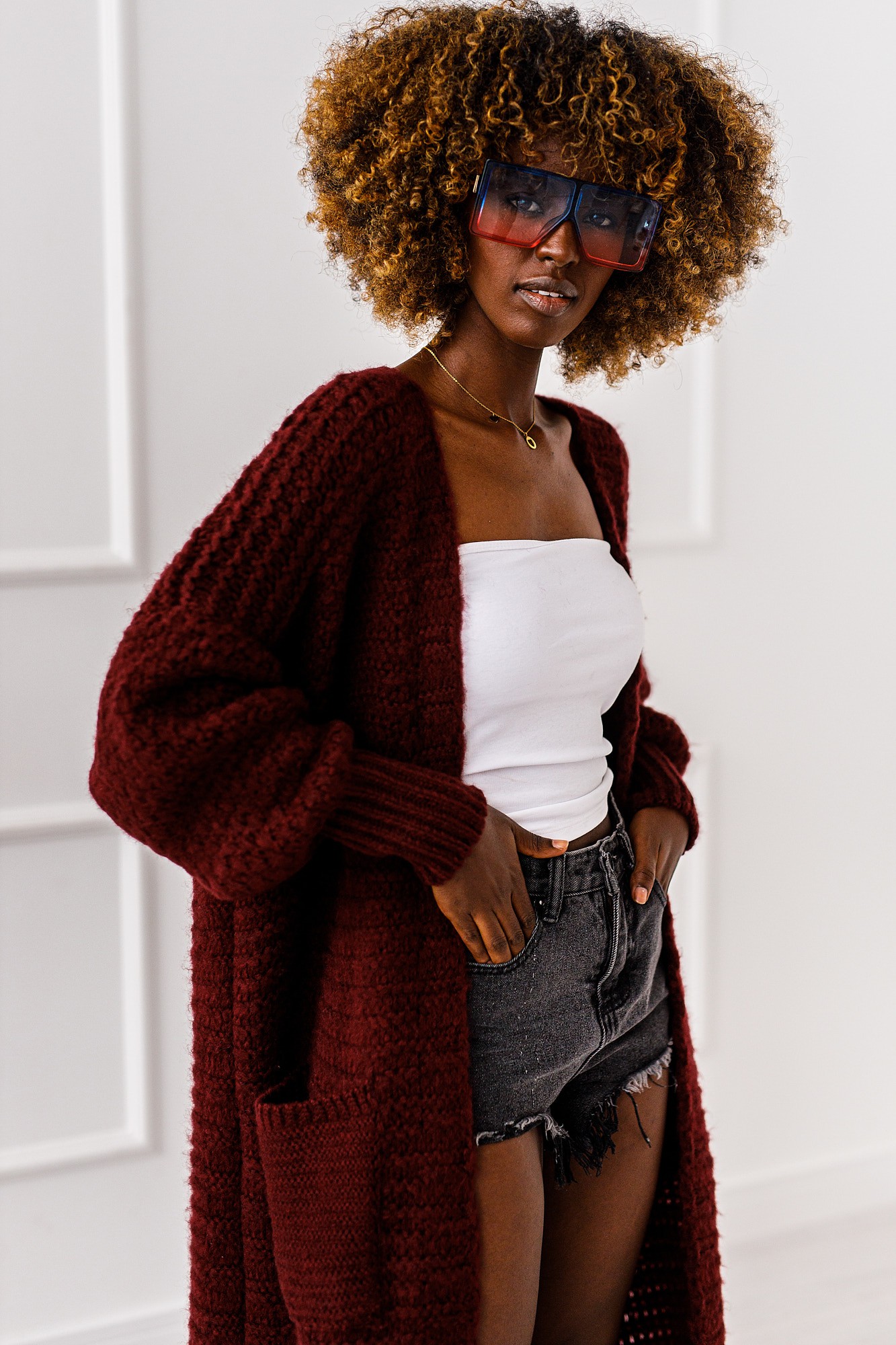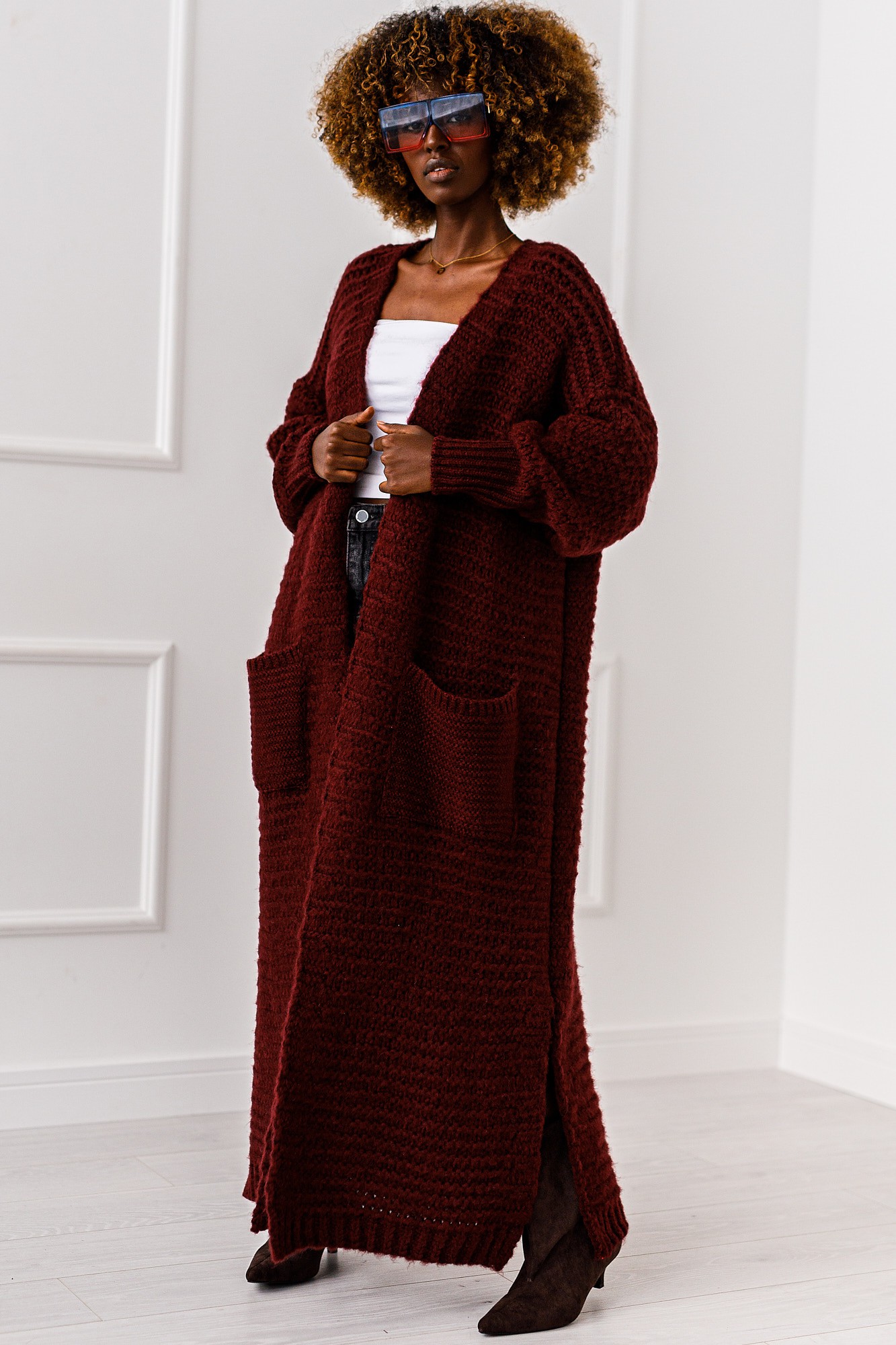 Bordowy Warm Flow kardigan wykonany z przyjemnego splotu, który zapewnia ciepło i swobodę ruchów. Dzięki kieszeniom z przodu oraz modnej długości maxi, nie tylko pięknie się prezentuje, ale też jest praktyczny.