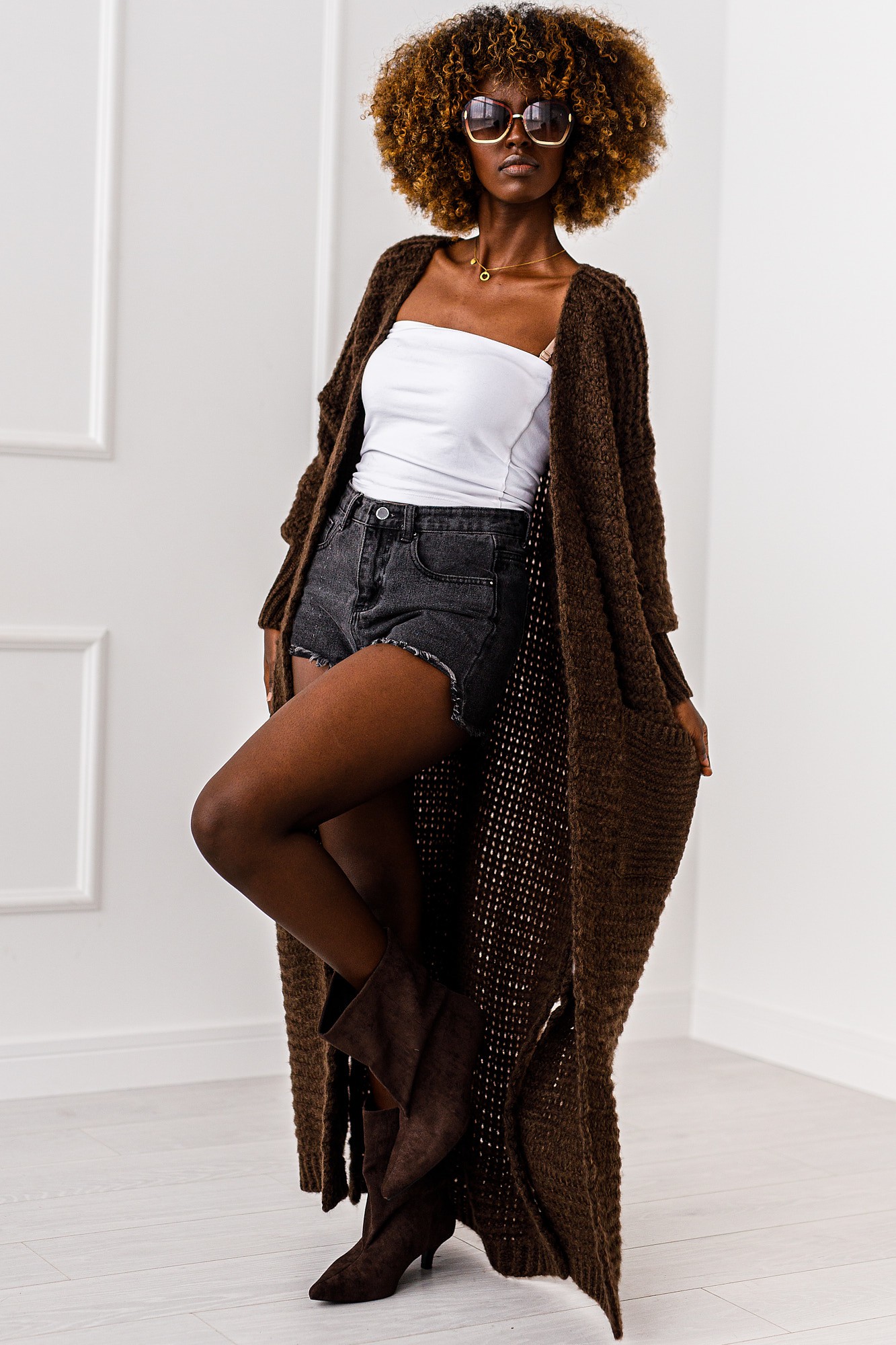 Czekoladowy Warm Flow kardigan wykonany z przyjemnego splotu, który zapewnia ciepło i swobodę ruchów. Dzięki kieszeniom z przodu oraz modnej długości maxi, nie tylko pięknie się prezentuje, ale też jest praktyczny.