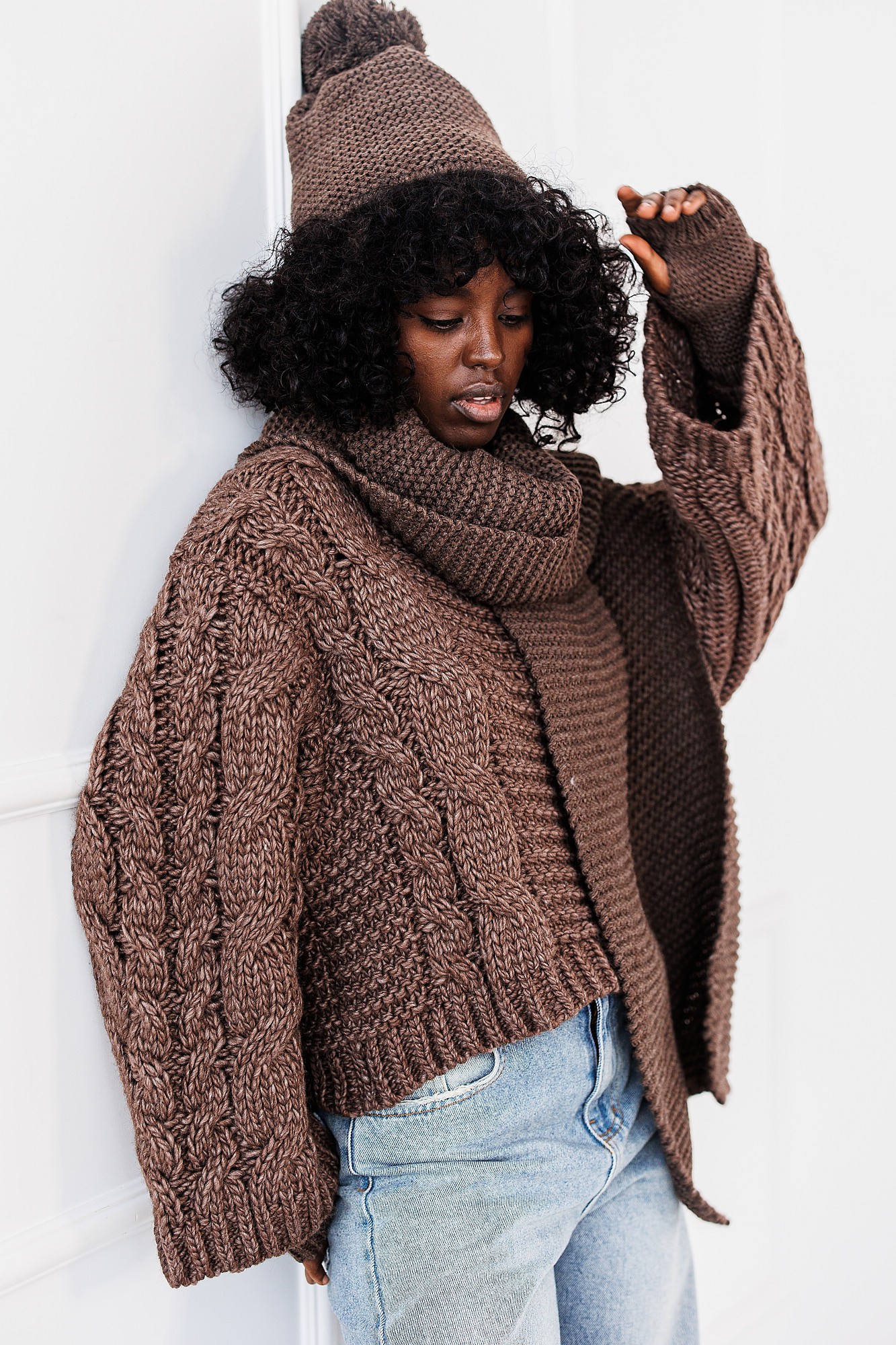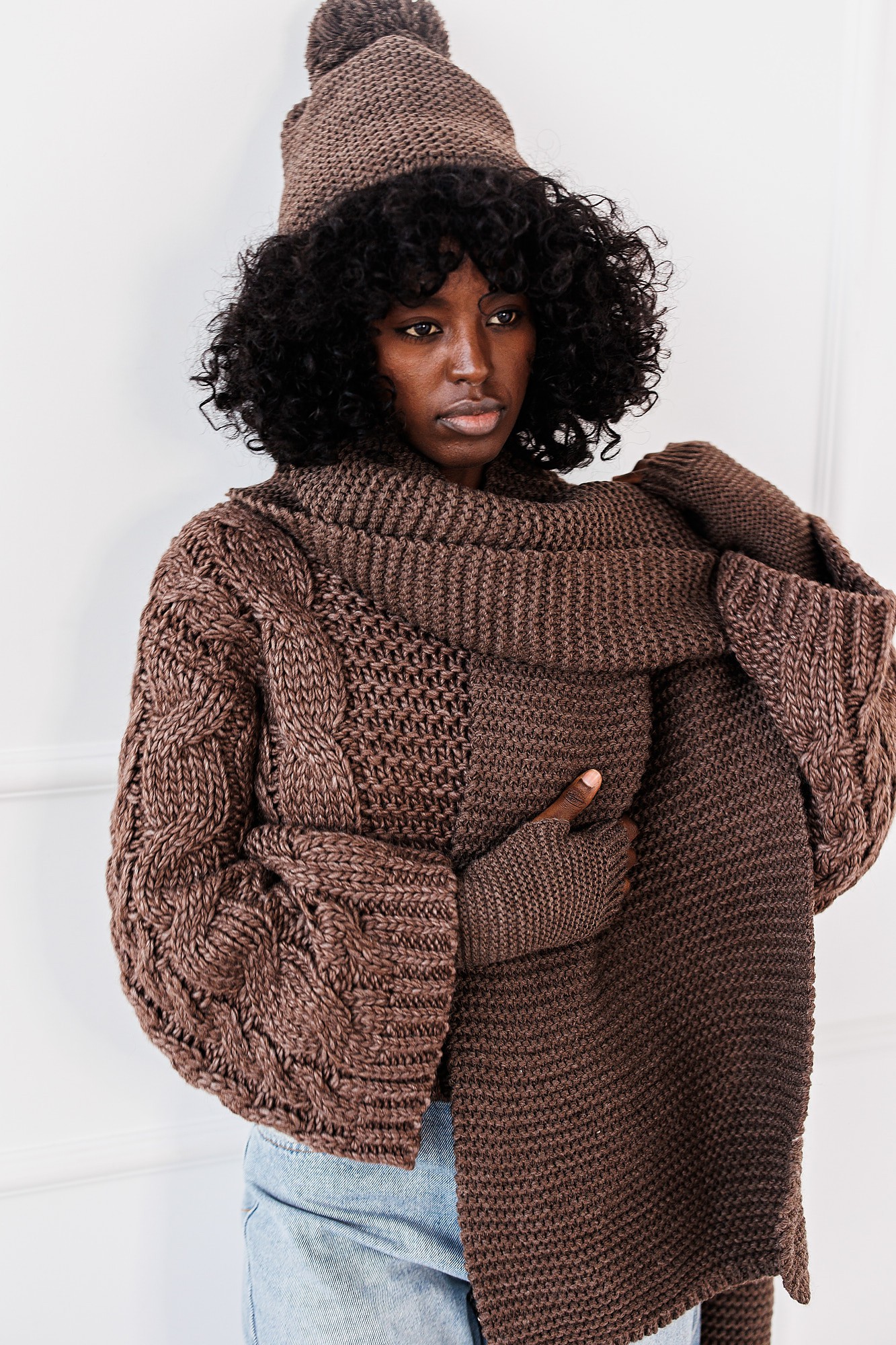 Brązowy Soft Touch Set, 3 cześciowy komplet. Ciepła czapka z wywinięciem i pomponem, długi i gruby szalik o gęstym splocie oraz rękawiczki bez palców.