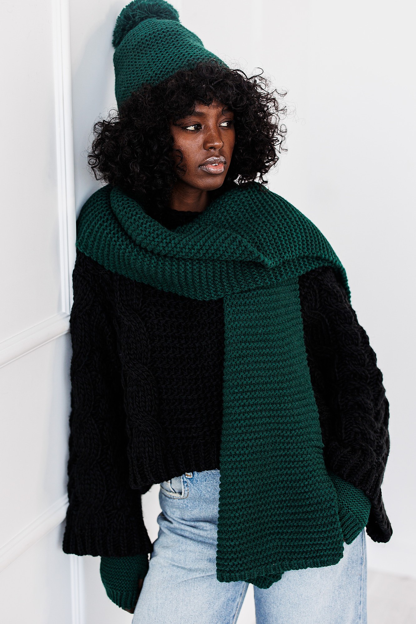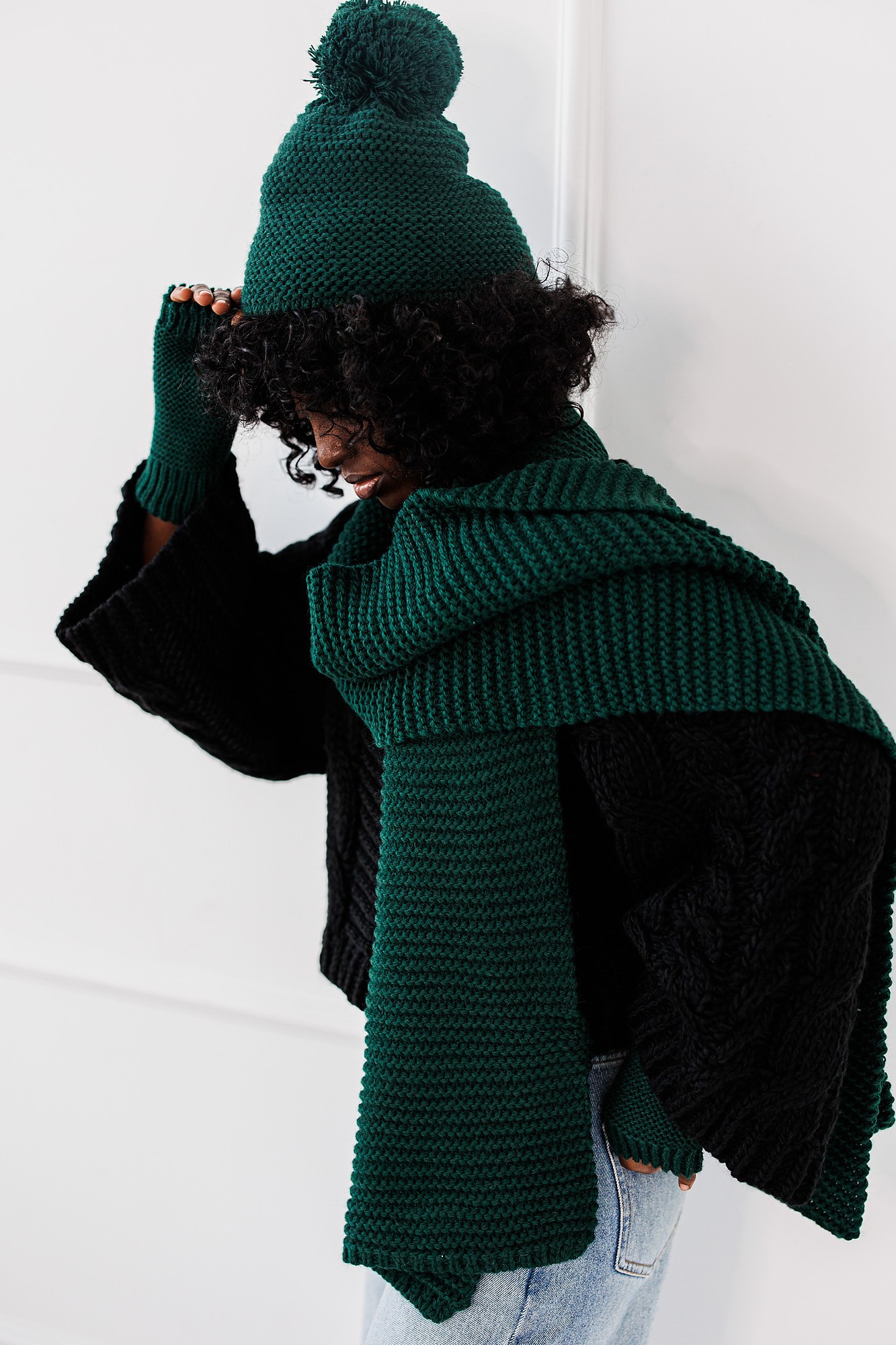 Butelkowo zielony Soft Touch Set, 3 cześciowy komplet. Ciepła czapka z wywinięciem i pomponem, długi i gruby szalik o gęstym splocie oraz rękawiczki bez palców.