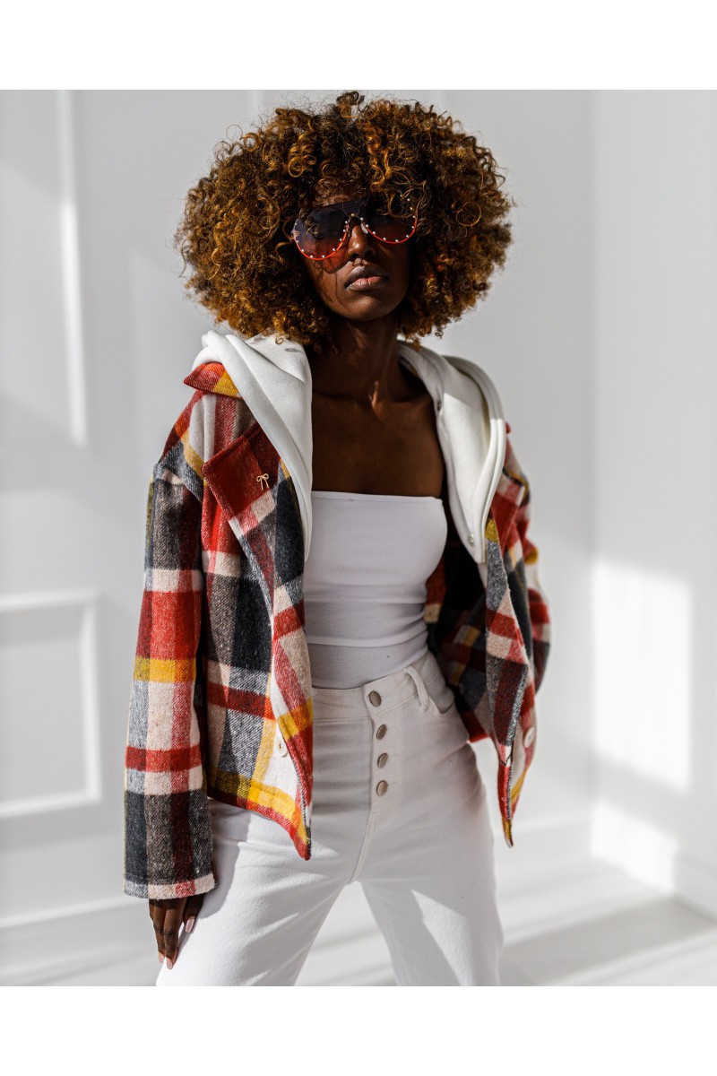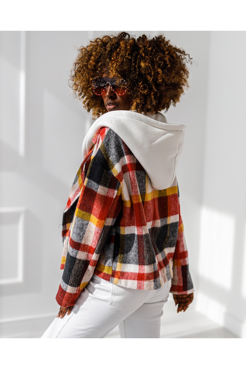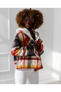 Kurtka w kratę czarno - pomarańczowa, posiada odpinany kaptur, modne połączenie kolorów.