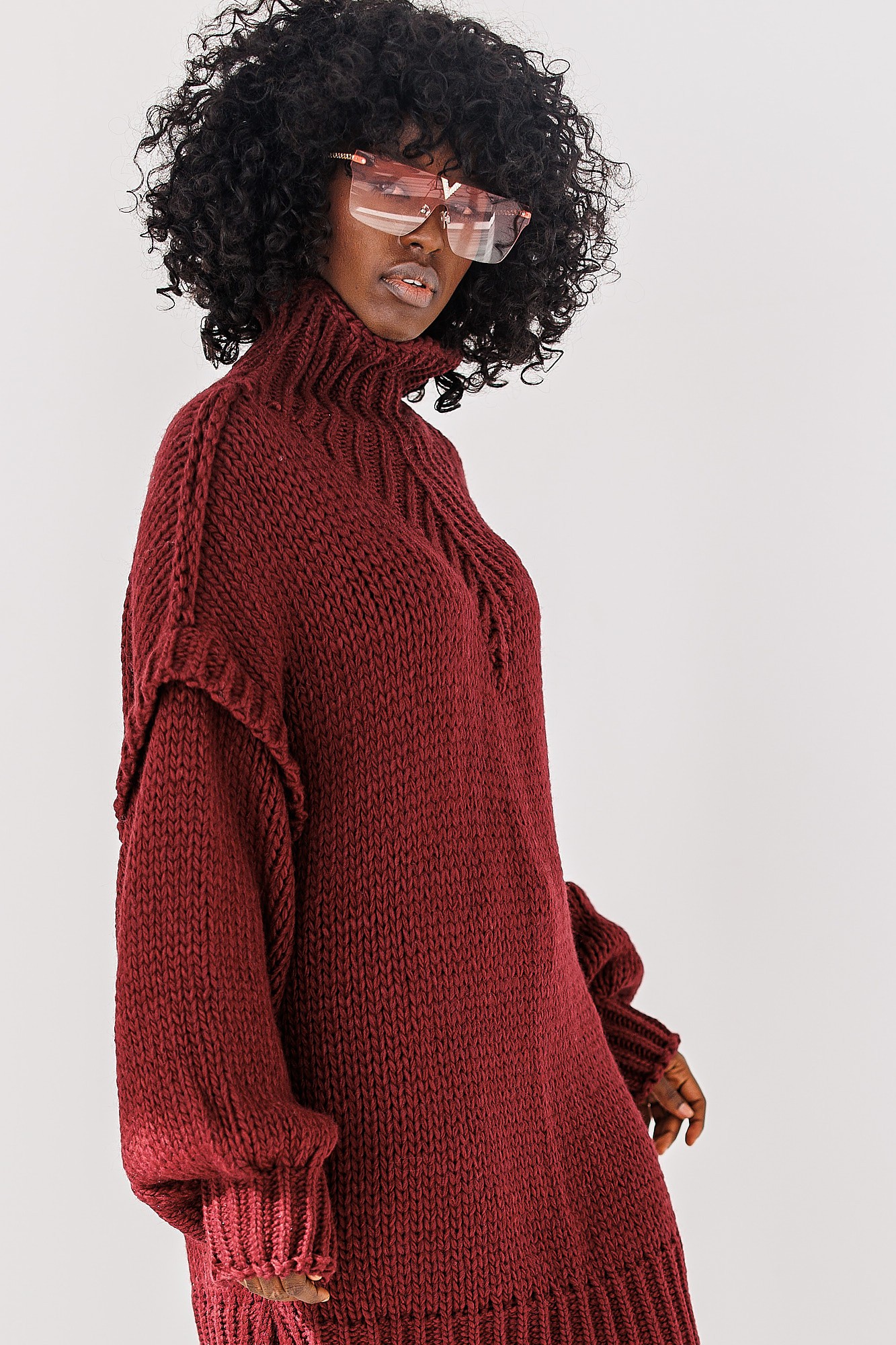 Bordowy sweter Noelle, styl, wygoda i ciepło w jednym. Charakterystyczny luźny krój i obszerne rękawy nadają mu modny, nowoczesny wygląd, a wydłużony fason pozwala nosić go zarówno jako sweter, jak i swetrową sukienkę.