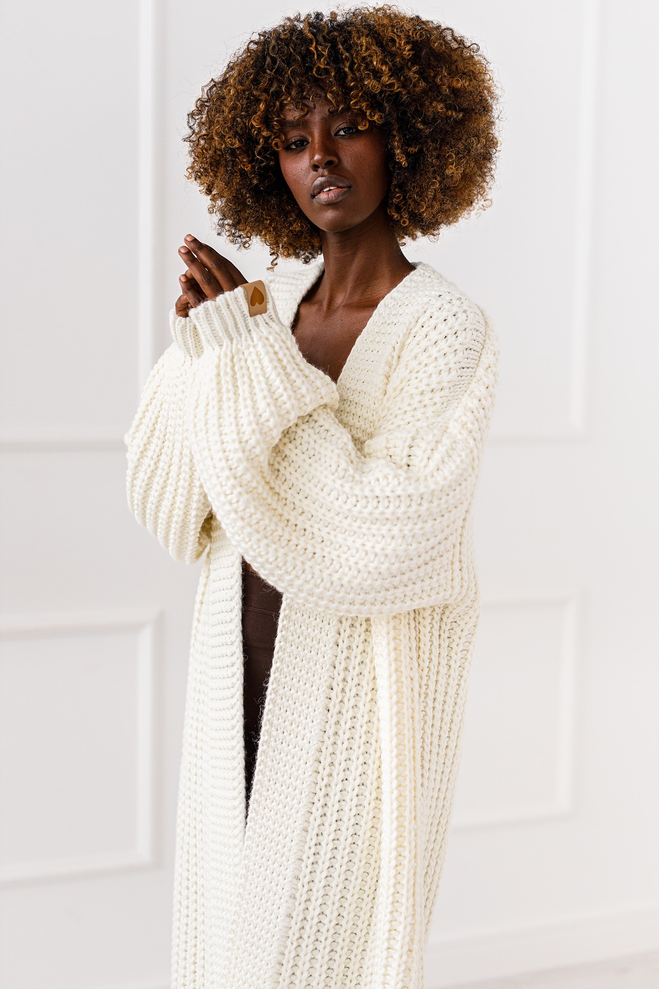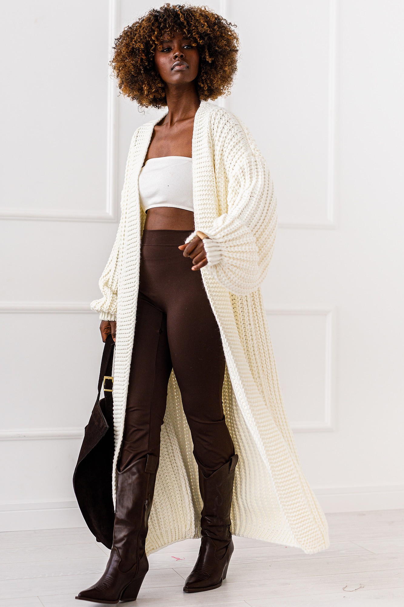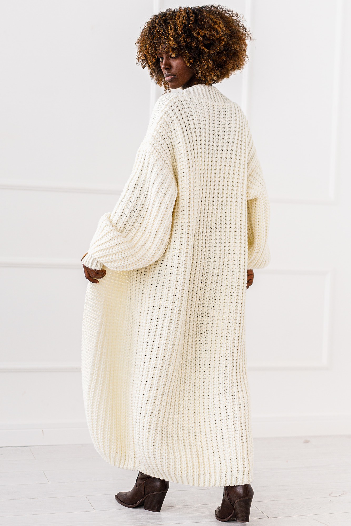 Śmietankowa Perła Long to miękki, oversizowy kardigan o grubym spocie - idealny na chłodniejsze dni. Wygodny, ciepły i stylowy.