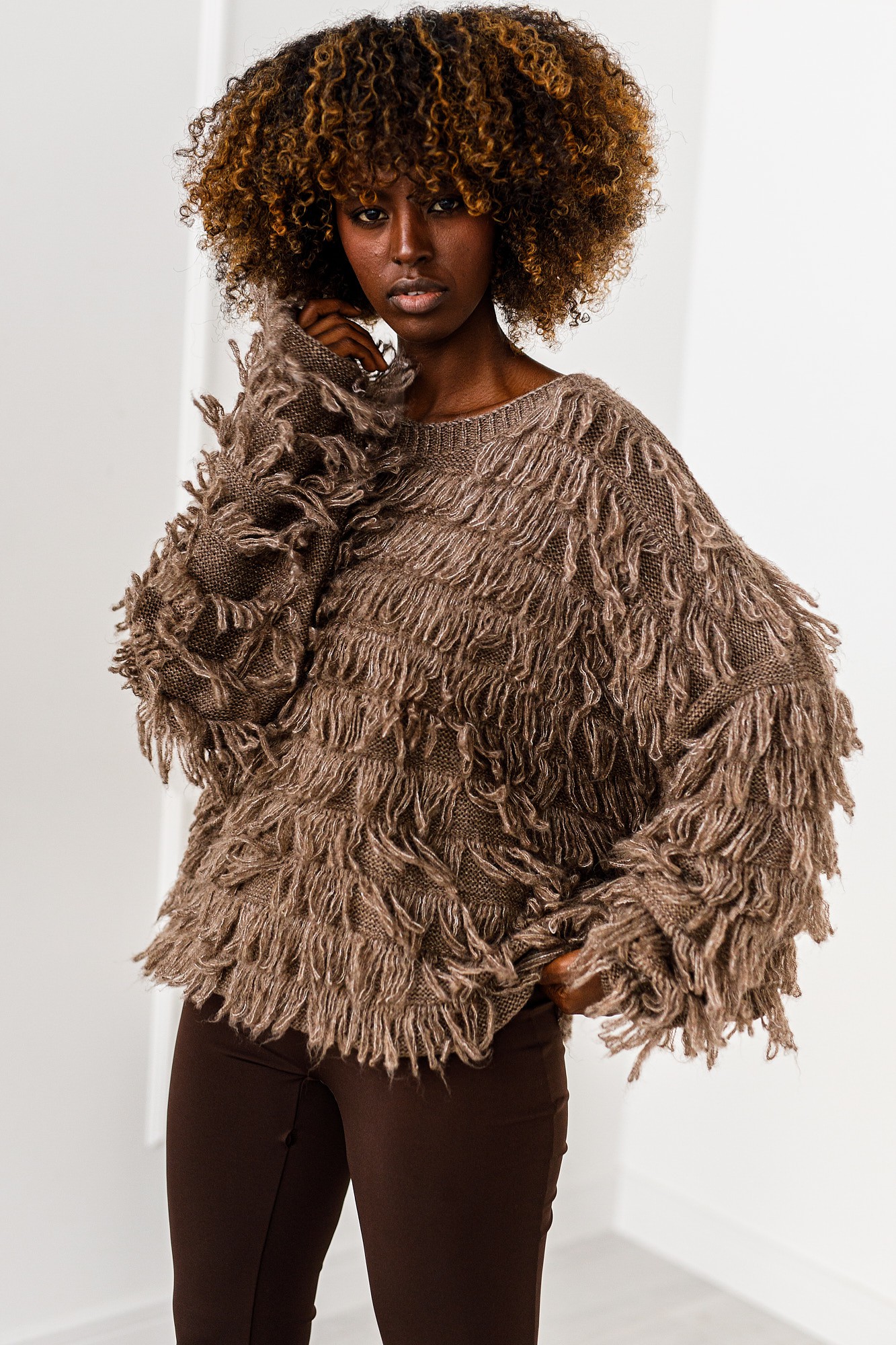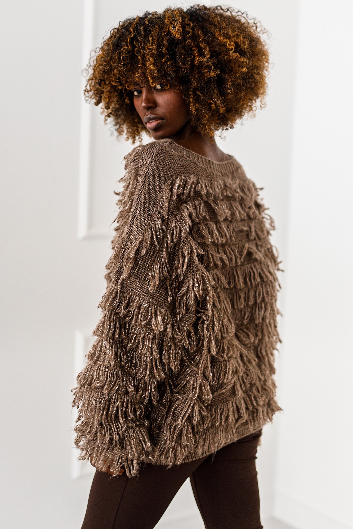 Ciemno beżowy sweter Shadow Flow to idealne połączenie stylu i komfortu. Luźny krój i frędzle nadają mu charakteru boho, a jednocześnie sprawiają, żę wygląda modnie i kobieco