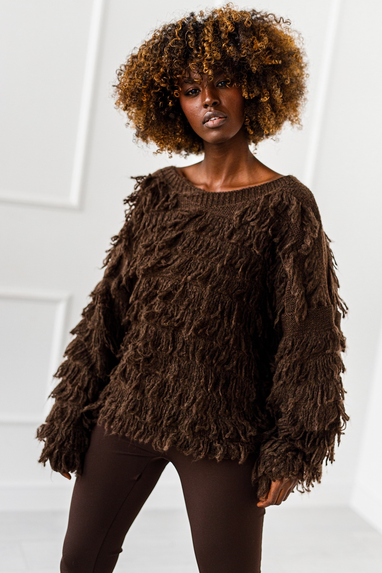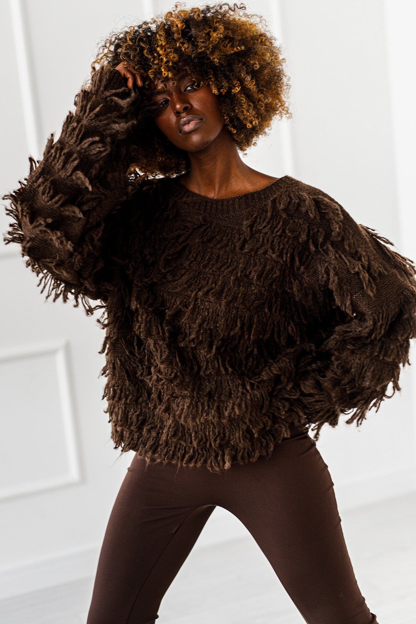 Czekoladowy sweter Shadow Flow to idealne połączenie stylu i komfortu. Luźny krój i frędzle nadają mu charakteru boho, a jednocześnie sprawiają, żę wygląda modnie i kobieco