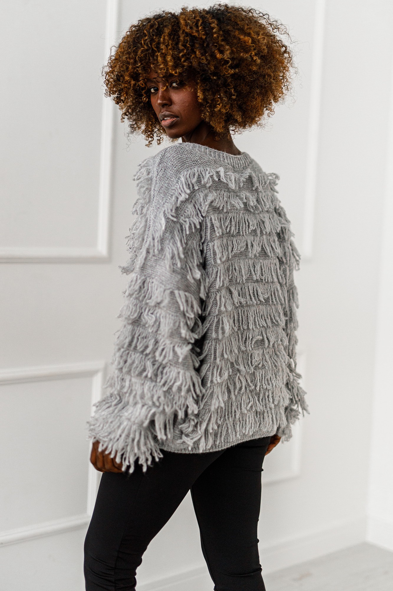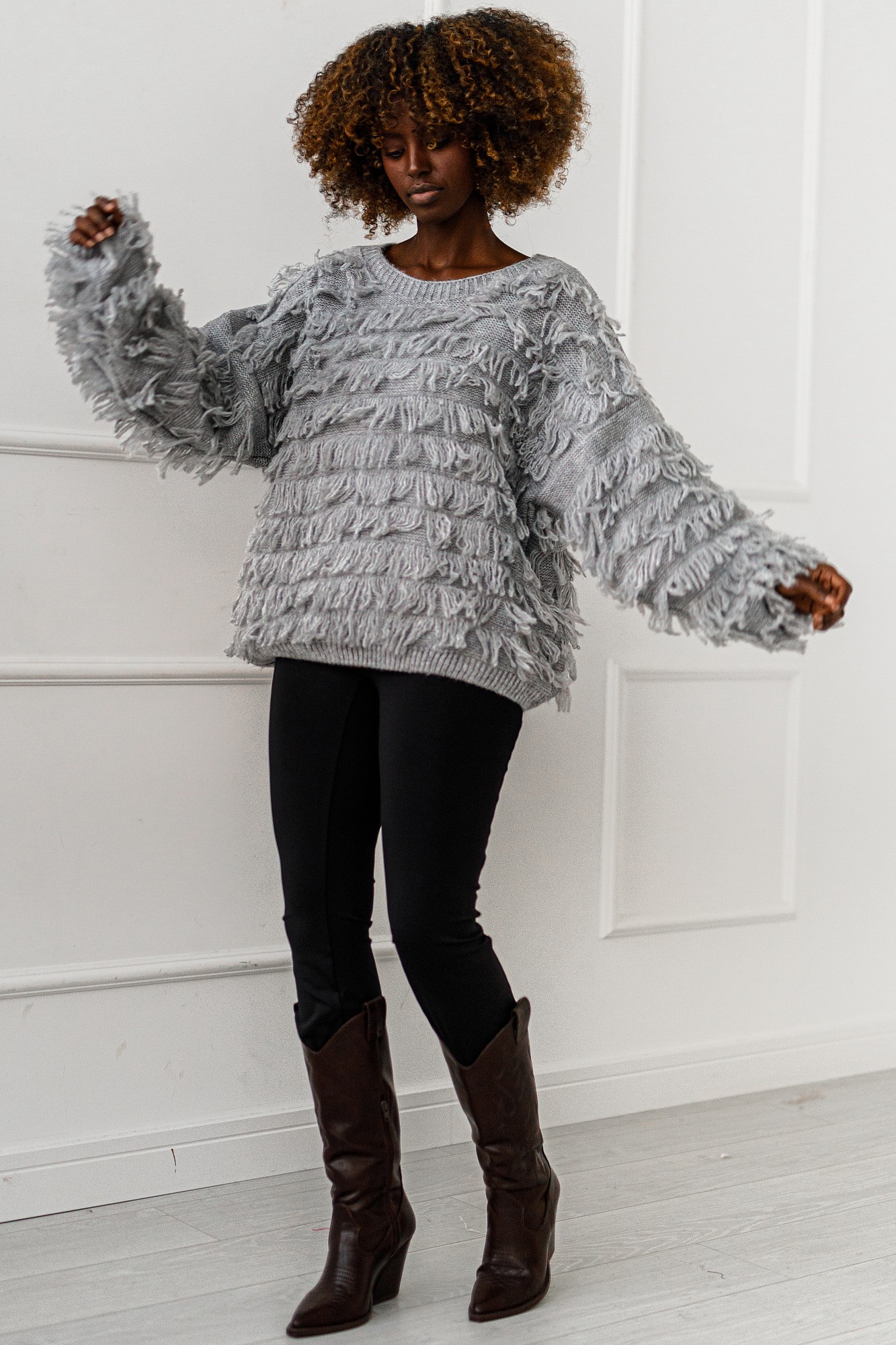 Szary sweter Shadow Flow to idealne połączenie stylu i komfortu. Luźny krój i frędzle nadają mu charakteru boho, a jednocześnie sprawiają, żę wygląda modnie i kobieco