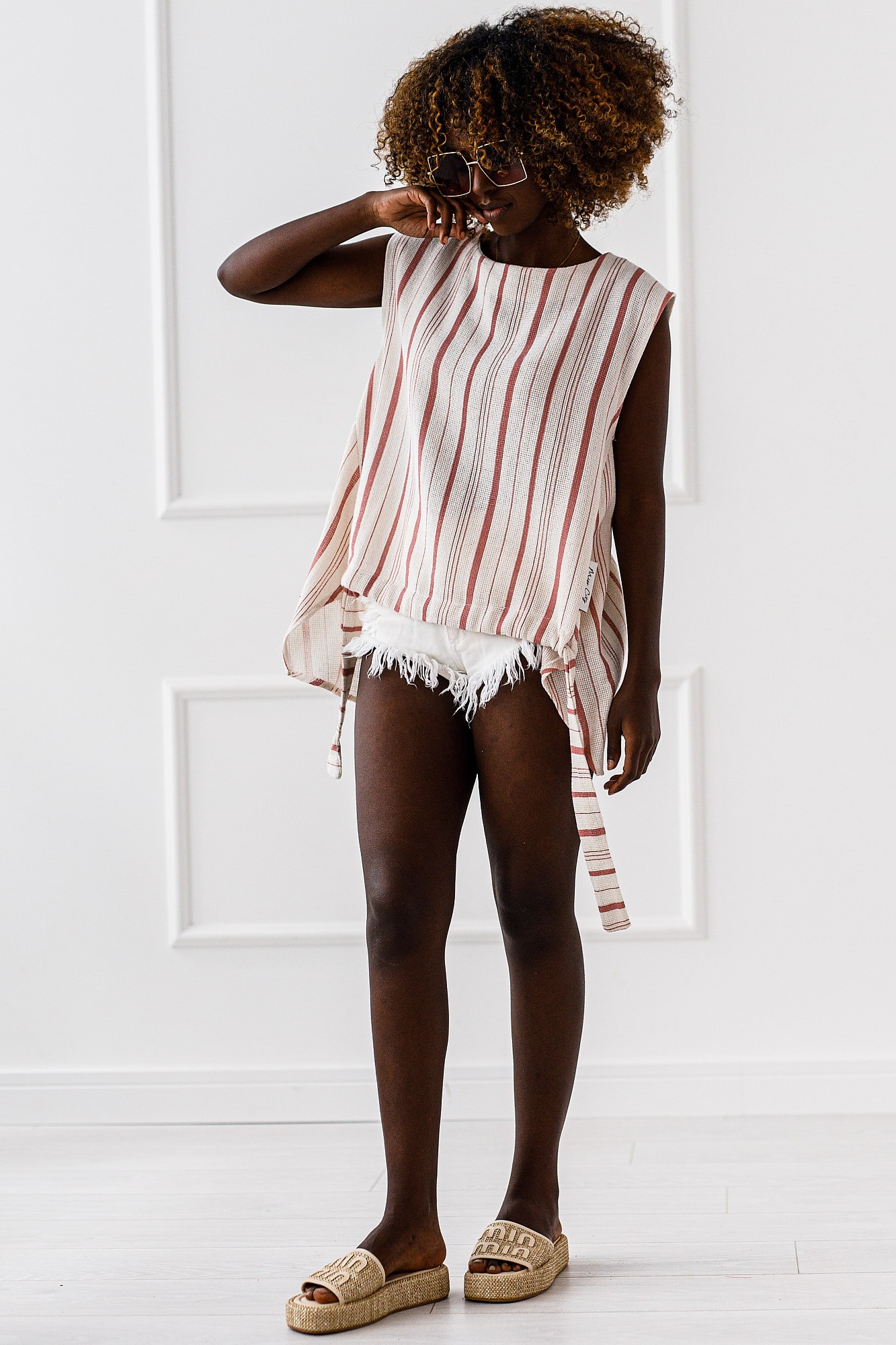 Бело-розовая блузка в полоску с широкими бретелями. Модная и воздушная модель с удлиненной спинкой.