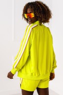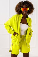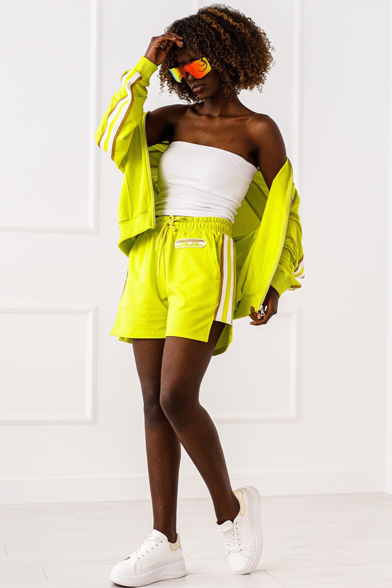 Траковый костюм лимонно-зеленого цвета с короткими шортами. Толстовка на молнии с окантовкой. Короткие шорты с завязками на талии и окантовкой по бокам.