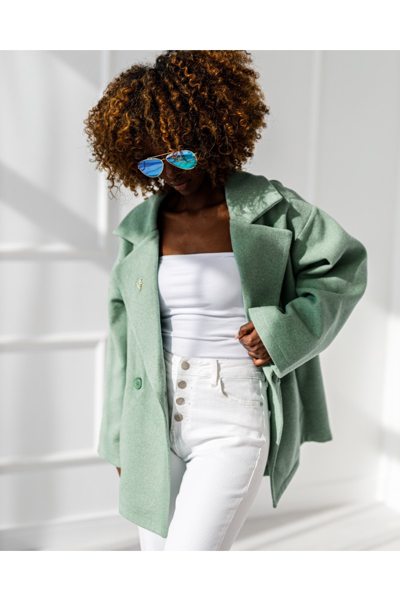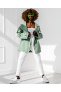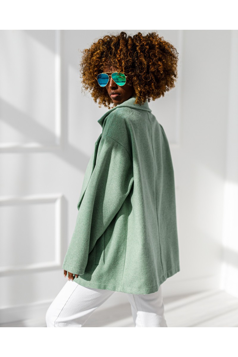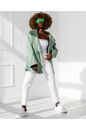 Dámska jarná bunda pistáciovej farby, ktorá má voľný strih so strednou dĺžkou.